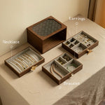 Time condenses into amber in the black walnut wheel of years, and the shadow of begonias is made into triple space and time by the glass. The wood grain is like the folded pages of an ancient book, holding up the pearls like morning dew and the broken diamonds like star chips, so that the silver bracelet and the gold chain can swim into a poem in the light-transparent lattice. Between the opening and closing of the wood fragrance surging, locking the tidal flow of time - to the wandering jewelry to the home of wood grain, to the nostalgia of the heart to the glazed gallery.